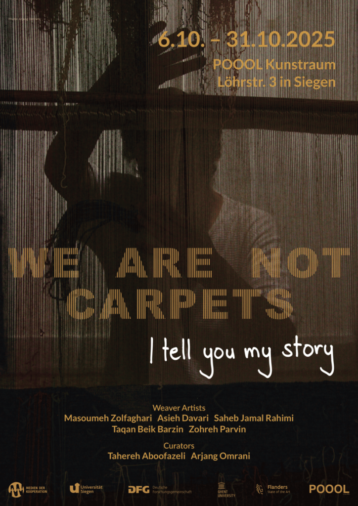 The presented carpets are the result of the collaborative research project “Weaving Memories” by Tahereh Aboofazeli und Arjang Omrani. Ten artist weavers from this region have participated in the „Weaving Memories“ project. Among those, five artist weavers are taking part in the installation in Siegen: Masoumeh Zolfaghari, Asieh Davari, Saheb Jamal Rahimi, Taqan Beik Barzin and Zohreh Parvin. Zoleikha Davari provides additional support with stabilizing weaving work.